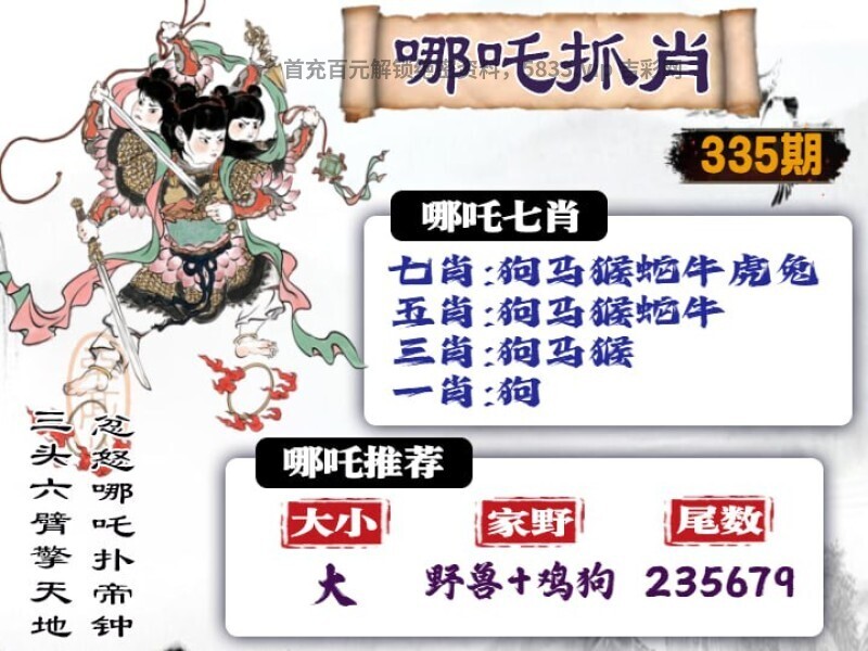 | 335期: ①七肖中特:狗马猴蛇牛虎兔 ②大小中特:大数 ③家野+2肖:野兽+鸡狗 |