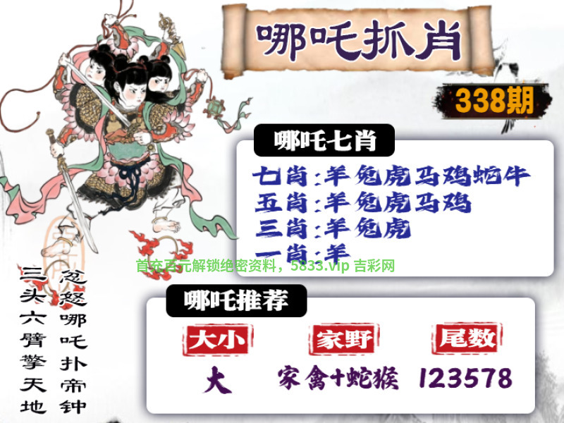 | 338期: ①七肖中特:羊兔虎马鸡蛇牛 ②大小中特:大数 ③家野+2肖:家禽+蛇猴 ④精准六尾:123578 |